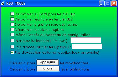Ce code permet de gérer les lecteurs(tout type), le panneau de configuration, les ports USB(pour les flash disks) l'accès ou non au registre..... Son utilisation vous fera découvrir les différentes options.