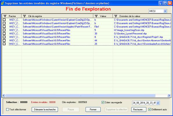 L'utilisation du code est sans garantie(pour la suppression) néanmoins une sauvegarde est faite pour toute suppression si la case à cocher "Créer sauvegarde" est activée. Un fichier de sauvegarde est alors automatiquement créé dont le nom(sans extension) est aussitôt affiché et visible dans le ComboBox ajouté à cette fin. Ledit fichier a pour nom la date et l'heure de l'enregistrement sous la forme : dd_mm_yyyy_hh_mm_ss(+l'extension .reg)