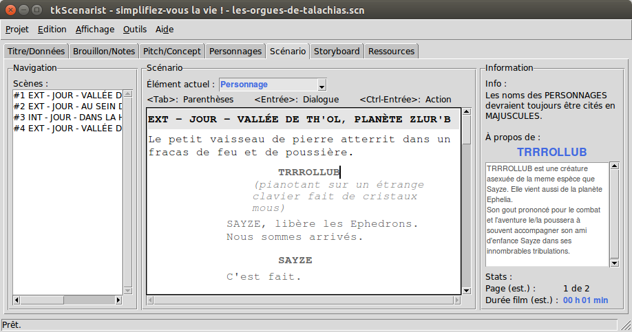 tkScenarist est une petite application écrite en Python3/Tkinter qui vise à faciliter la rédaction de scénarios de films pour tous les scénaristes en herbe, futurs et à venir.