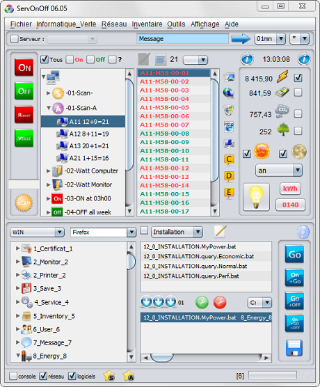 - Optimisation de la consommation électrique d'un réseau d'ordinateurs : extinctions ou mises en veille intelligentes, avec message d'annulation et gestion des sessions ouvertes ou non...
