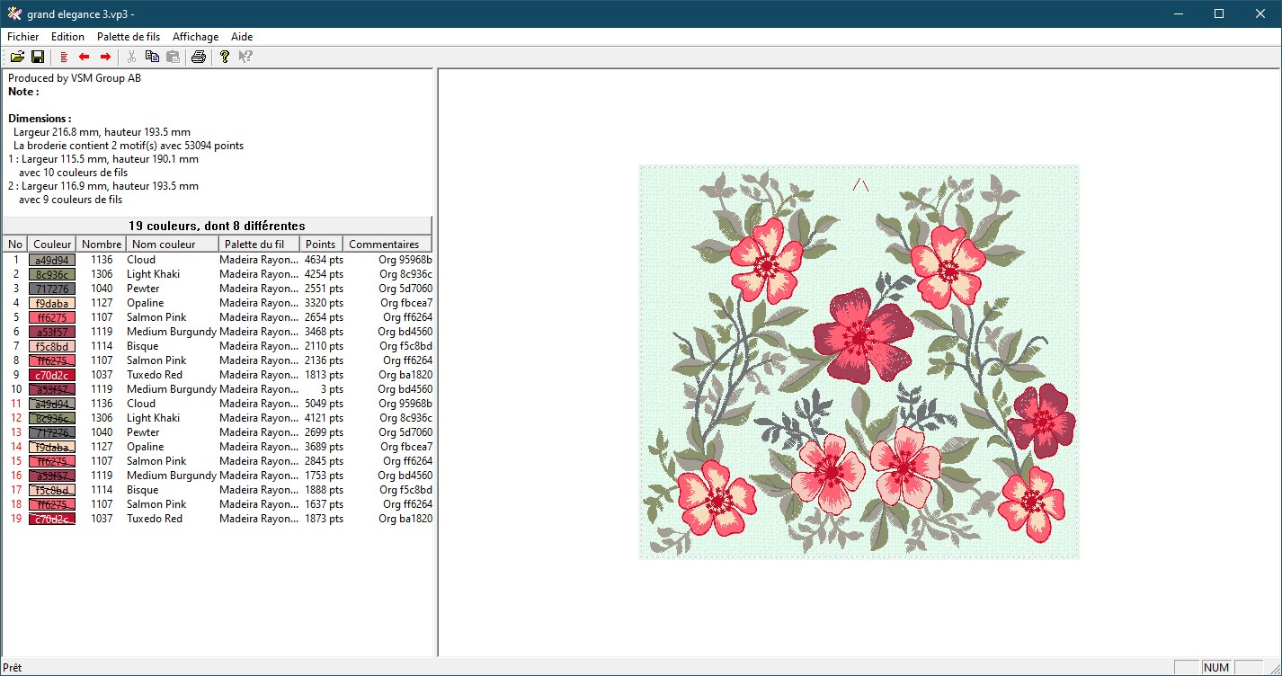 Une des fonctions du programme et de permettre d’utiliser le stock de fil que chaque amateur de broderies possède. Et pour réaliser des modèles qui ont toutes les chances de ne pas faire appel à ces fils (fabricants ou qualités différentes), l’idée est de créer un fichier comptabilisant les fils du stock et ensuite appairer automatiquement ces fils au modèle projeté en respectant au mieux les couleurs. Pour cette fonction le programme permet de créer une Palette de fils regroupant tous les fils disponibles puis possède une commande permettant de remplacer les fils du modèle par ceux de la palette. Le format de fichier choisi pour cette fonction est *.vp3 qui a les caractéristiques requises (permettre un grand nombre de fils et de couleurs et ne pas imposer la présence d'un motif de broderie).